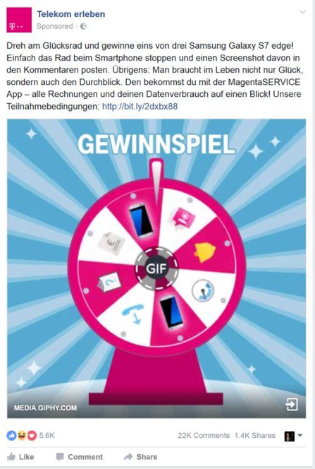 With such an animated GIF, for example, a raffle can be organized. The Telekom company has done the same. The raffle element was a wheel of fortune in the form of a GIF. Users had to stop the GIF just as the needle was standing on one of the two Galaxy smart phones and then posting a screenshot of it. Nearly 40,000 people have done the same.