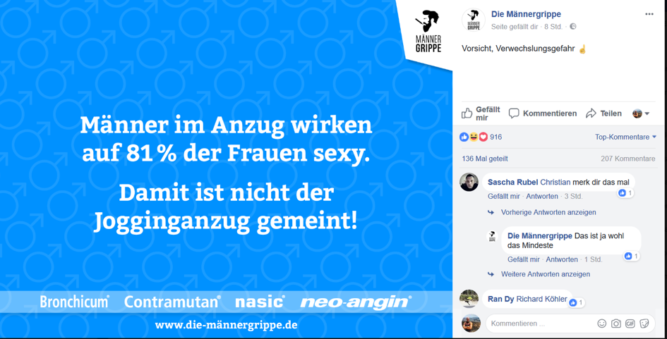 The Klosterfrau Healthcare Group runs the fan page “The Men’s Flu” (the overall strategy also includes a website, appearances on Twitter, Instagram and YouTube as well as offline advertising media in pharmacies).