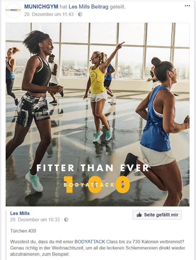 The fitness courses provider LES MILLS (partially) pursues this strategy. The content will be created to fit the fitness studios that ultimately offer the courses and their members. Accordingly, the posts are often shared by the gym. LES MILLS could do a lot more though, there is definitely still room for improvement.
