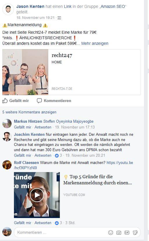 A good example of this strategy is lawyer Rolf Claessen, who is on Facebook a member in pretty much every Amazon group. As a patent attorney specializing in patent and trademark law, he mainly looks after Amazon dealers in trademark and other e-commerce issues. He reads carefully in all these groups. When asked the appropriate question, he posts a link to one of his YouTube videos in response.